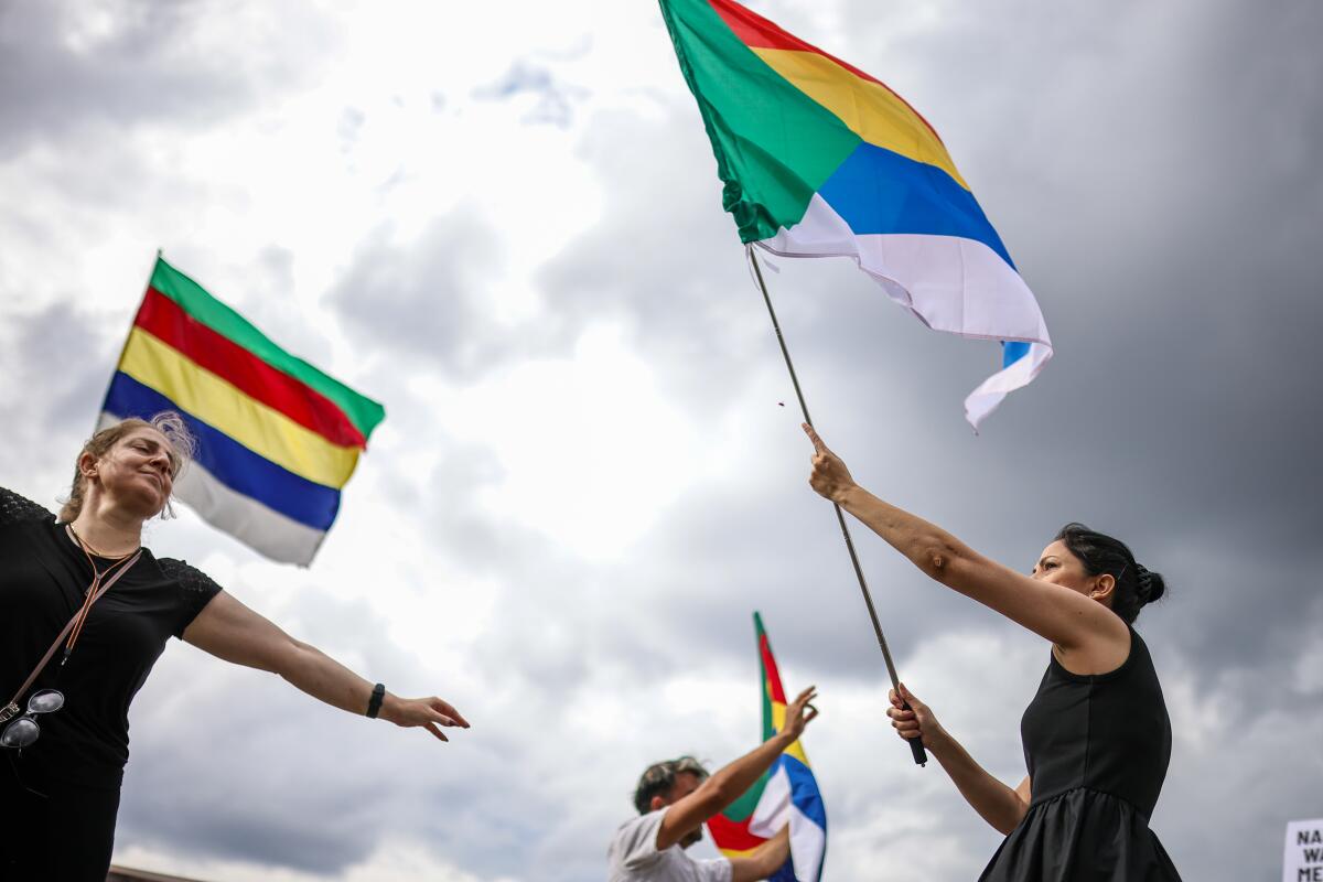 Demonstrators dance with the Druze flag as they gather in front of the Berlin Cathedral to voice solidarity for Druze communities in Syria on Aug. 30 in Berlin.