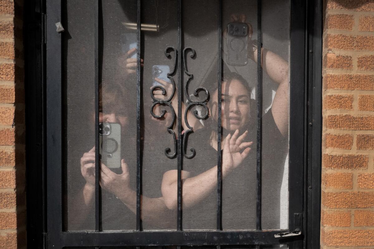 A minivan stopped near us and rolled down its window. “We lost them by Central and 26th!” shouted 32-year-old Mariana Ochoa from the back seat as she held her son on her lap. Joining us now was a masked 18-year-old college student who went by Ella and is a U.S. citizen along with her parents. She rattled off all the locations where her WhatsApp group had spotted ICE that morning. Lopez texted them to his own group.