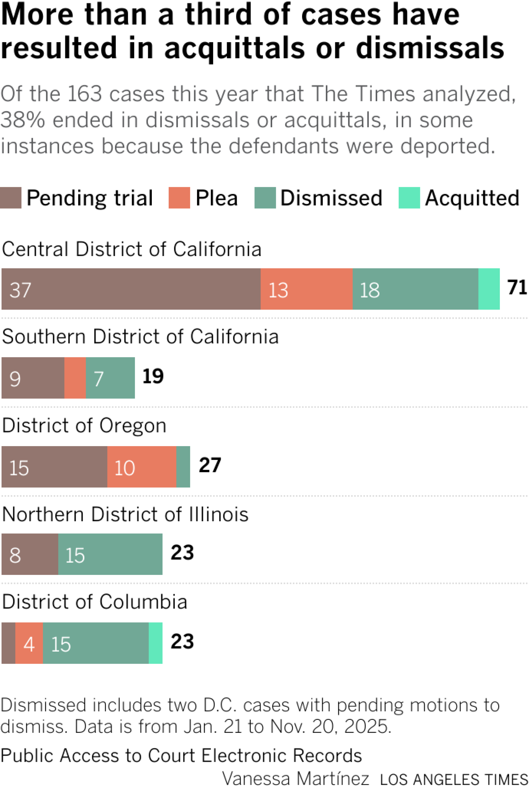 During the umbrella assault trial in October, prosecutors provided no evidence of any injuries. In L.A. and across the country, defendants accused of assaulting federal officers have won acquittals or had charges dropped. More than a third of the cases The Times analyzed ended in dismissals or acquittals, in some instances because the defendants were deported. No cases have ended in a conviction at trial.