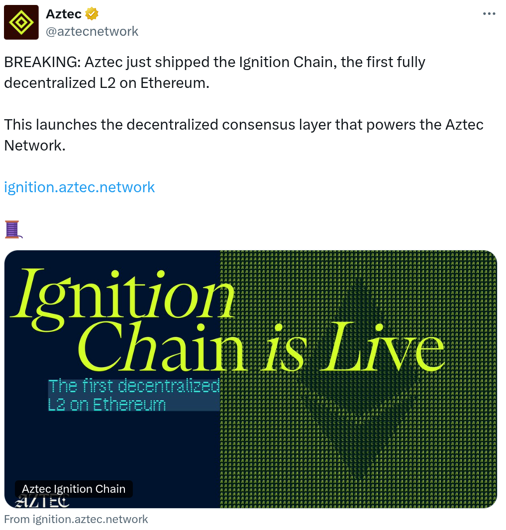 According to an Aztec email viewed by Cointelegraph, Aztec has launched its “Ignition” mainnet chain, a functional consensus-producing chain that generates blocks, but without the smart contract execution layer.