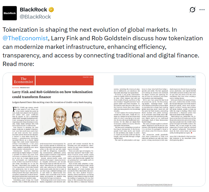 In an opinion article penned by Fink and Goldstein and published Monday in The Economist, the pair said that tokenization won’t replace the existing financial system any time soon, but predict it will help merge the two industries.