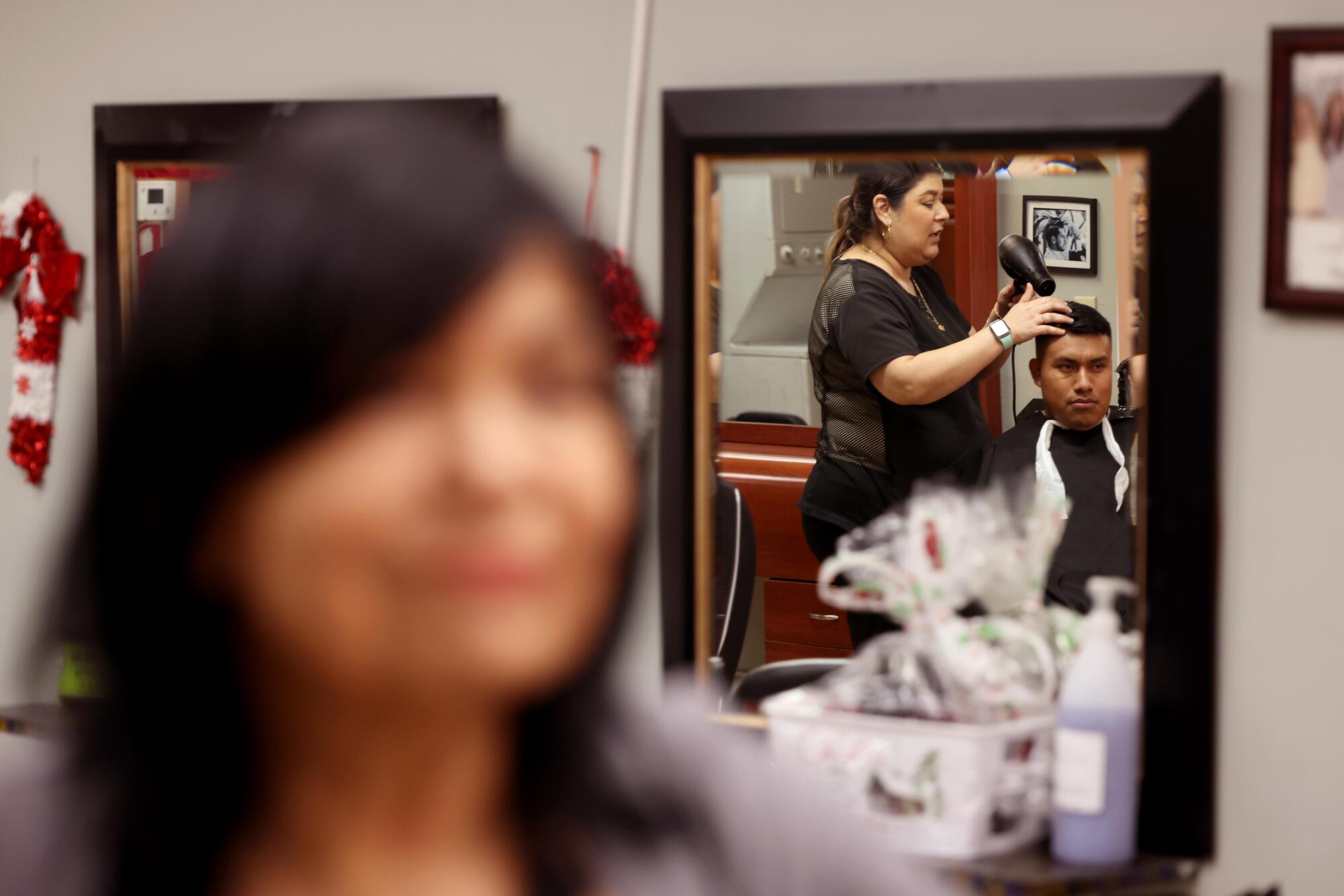 Jacqueline Rodriguez, in mirror, works on a customer’s hair as Silvia Lopez, left, owner of Divine Hair Design, waits for customers in downtown Oxnard on Dec. 19, 2025.