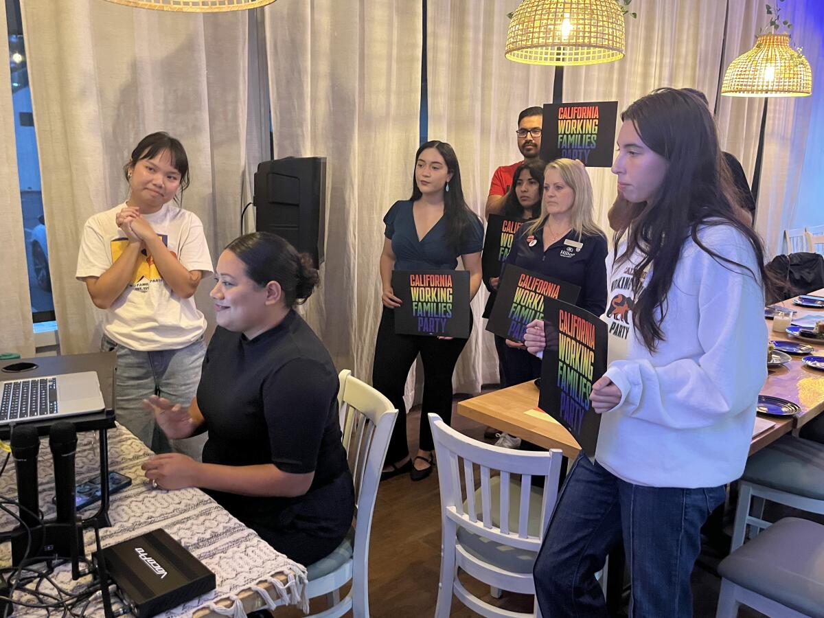 About a dozen people at a watch party on Oct. 14, 2025, at Tulum OC, a Mexican restaurant in Anaheim, of a virtual discussion between members of the California Working Families Party and former Rep. Katie Porter.