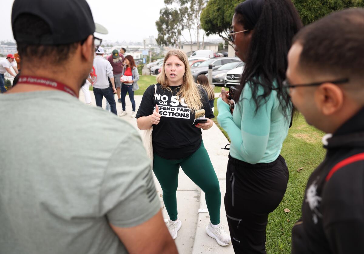Ariana Assenmacher, of California Young Republicans, center, organizes during a gathering of Republican Party members pressing to vote no on Proposition 50 in the upcoming California Statewide Special Election at John Wayne Park in Newport Beach on Saturday, November 1, 2025.