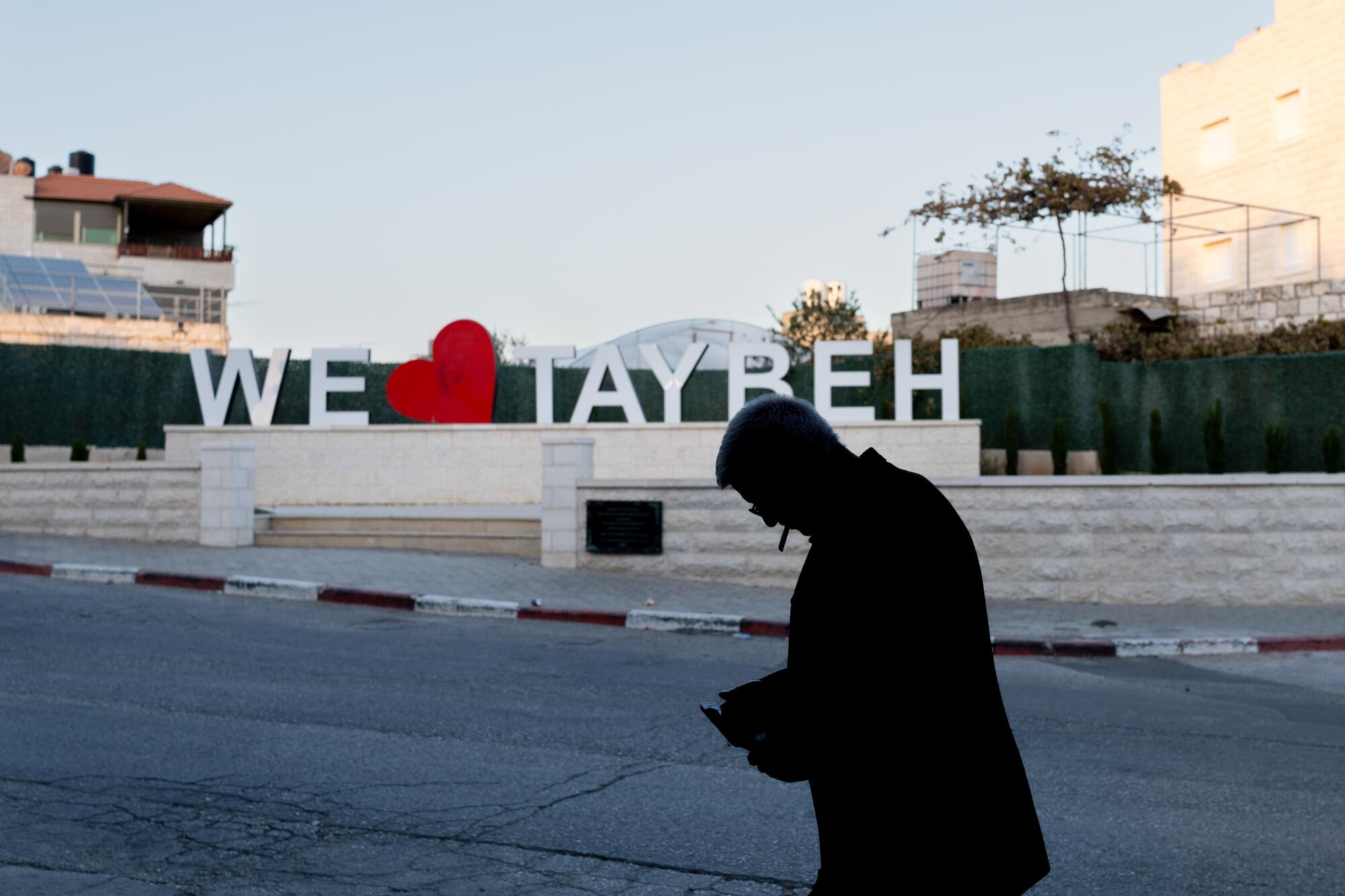 A man walks up the main road in Taybeh, a West Bank village of 1,200 residents that is proud of its heritage.
