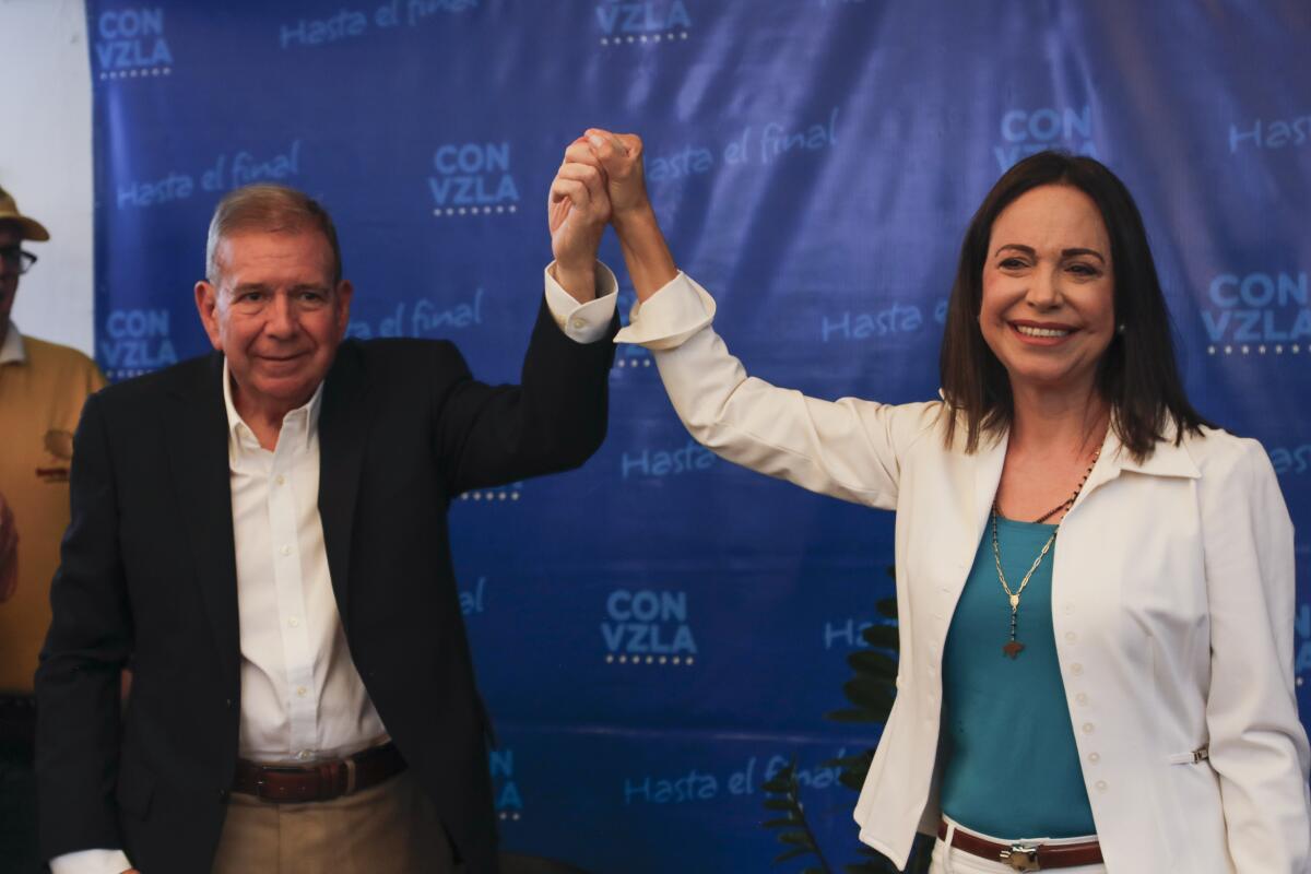 Opposition leader María Corina Machado and the opposition’s presidential candidate Edmundo González Urrutia at a news in Caracas, Venezuela, on July 25, 2024, a month before that year’s presidential election.