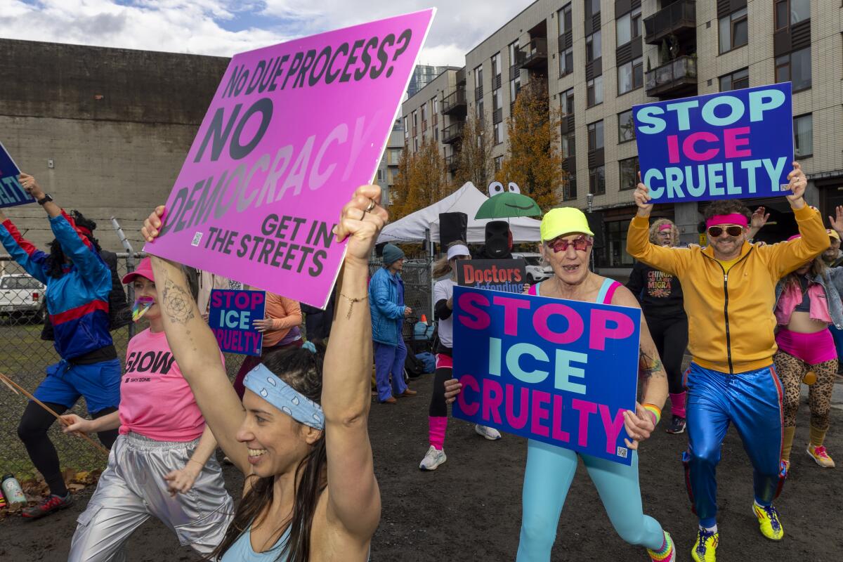 Protesters in 1980s style aerobic outfits work out during a demonstration dubbed “Sweatin’ Out the Fascists” on Sunday in Portland, Ore.