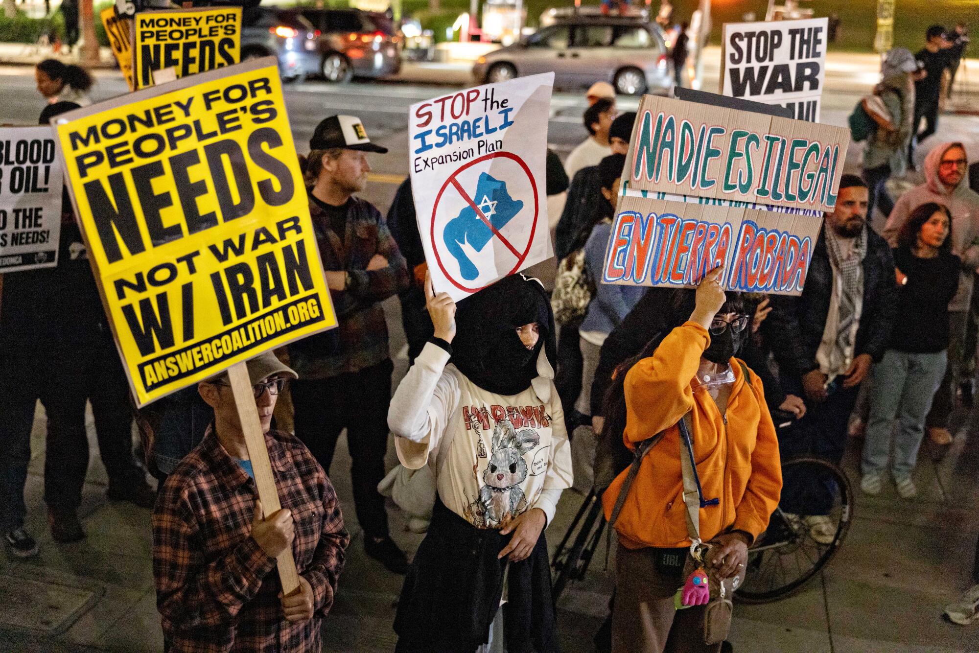 More than 200 people protest the U.S. and Israel’s war against Iran in front of City Hall in downtown Los Angeles on Saturday. Protesters carried Mexican, Palestinian and Iranian flags at the rally organized by the Answer Coalition.