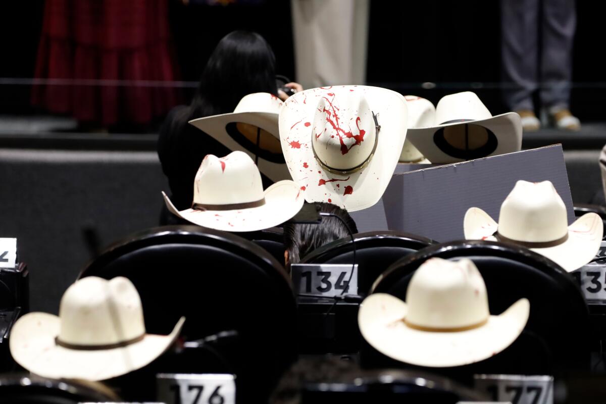 Legislators from the Institutional Revolutionary Party (PRI) placed hats painted like blood on their seats in condemnation of the murder of Uruapan Mayor Carlos Manzo during a session in the Chamber of Deputies on Nov. 4, 2025, in Mexico City.