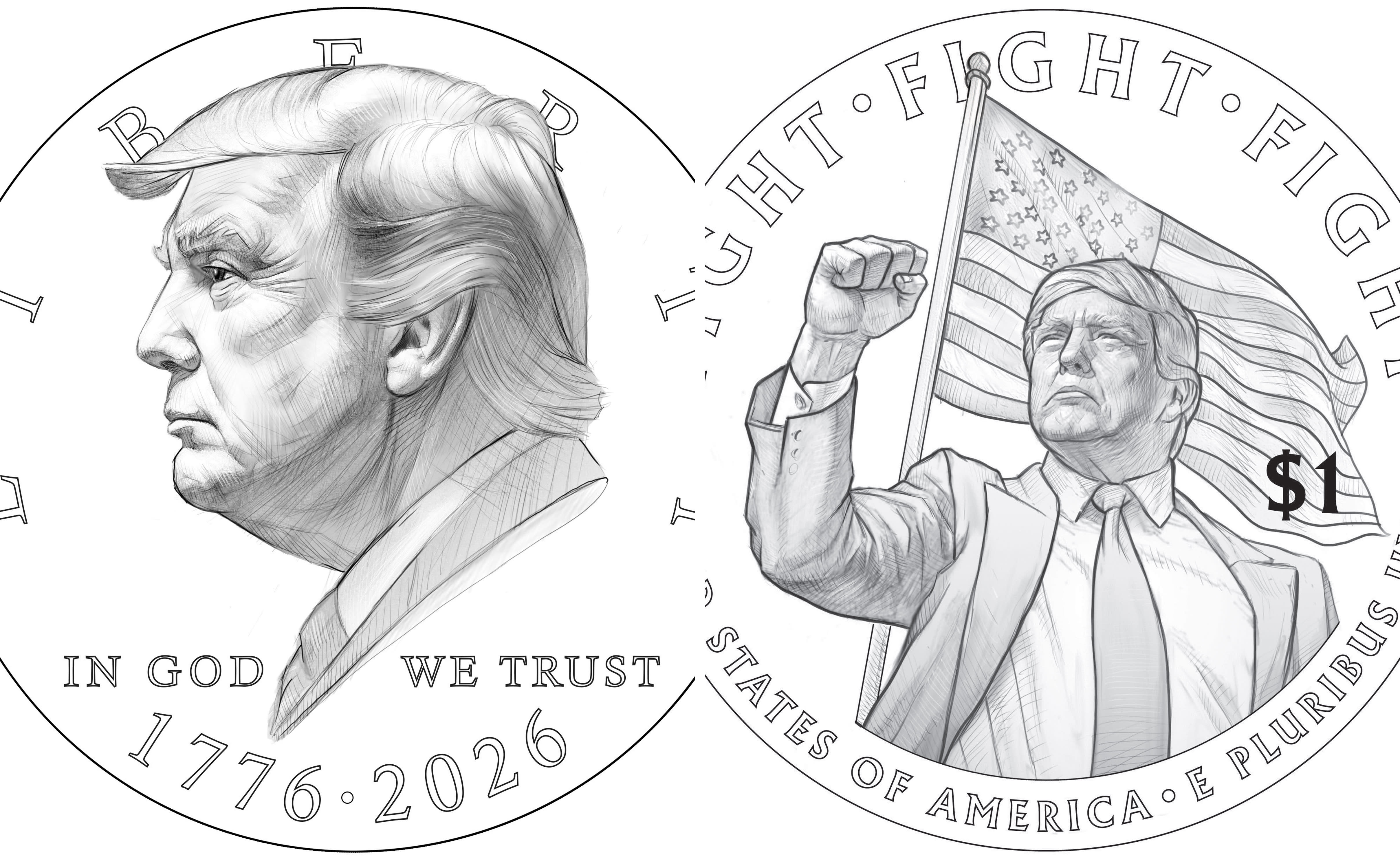 The other side of the coin shows a defiant-looking Trump raising his fist, closely matching the pose he struck moments after surviving an assassination attempt at a 2024 presidential campaign rally in Pennsylvania.