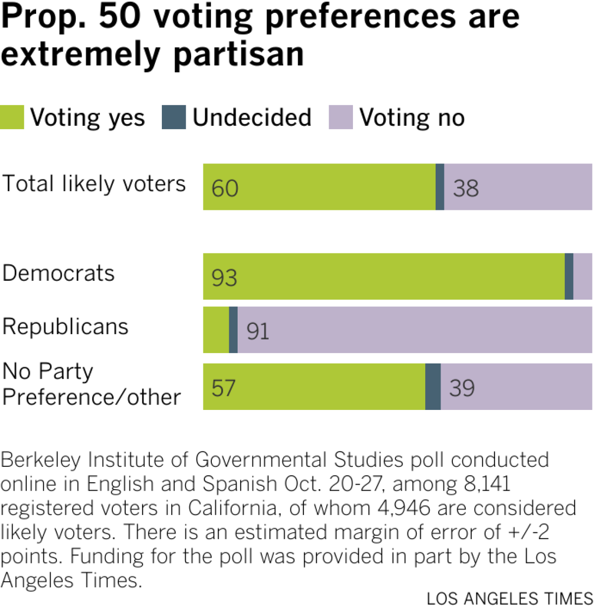 The Berkeley IGS/Times poll surveyed 8,141 California registered voters online in English and Spanish from Oct. 20 to 27. The results are estimated to have a margin of error of 2 percentage points in either direction in the overall sample, and larger numbers for subgroups.